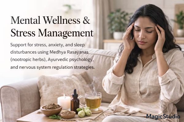 Support for stress, anxiety, and sleep disturbances using Medhya Rasayanas (nootropic herbs), Ayurvedic psychology, and nervous system regulation strategies.